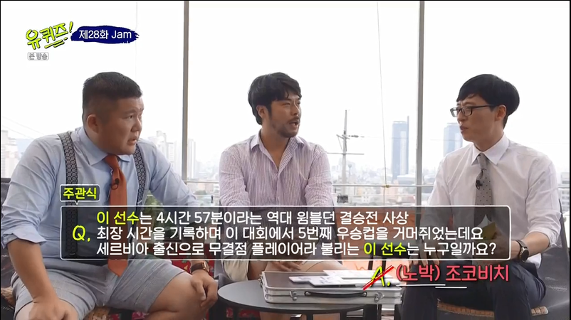 Q. 이 선수는 4시간 57분이라는 역대 윔블던 결승전 사상 최장 시간을 기록하며 이 대회에서 5번째 우승컵을 거머쥐었는데요. 세르비아 출신으로 무결점 플레이어라 불리는 이 선수는 누구일까요?