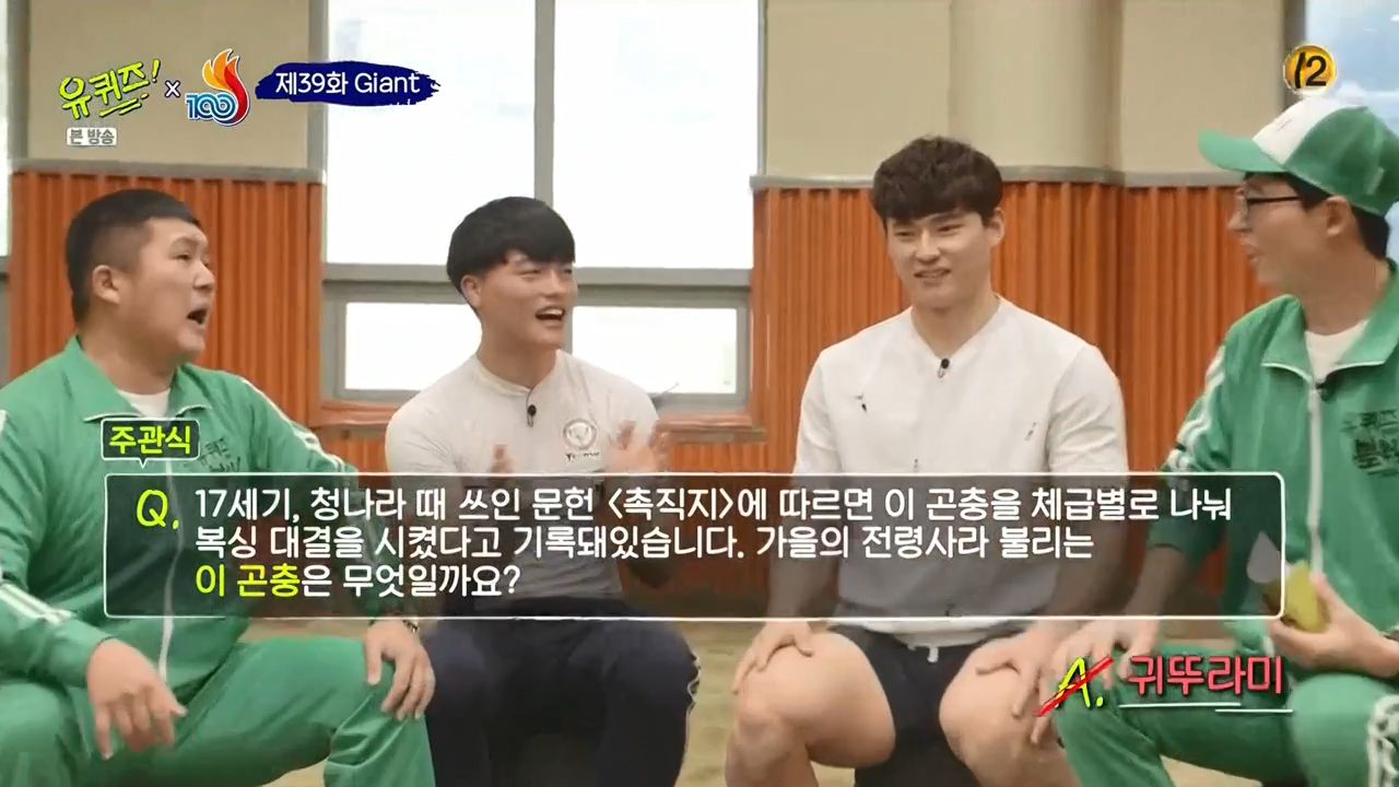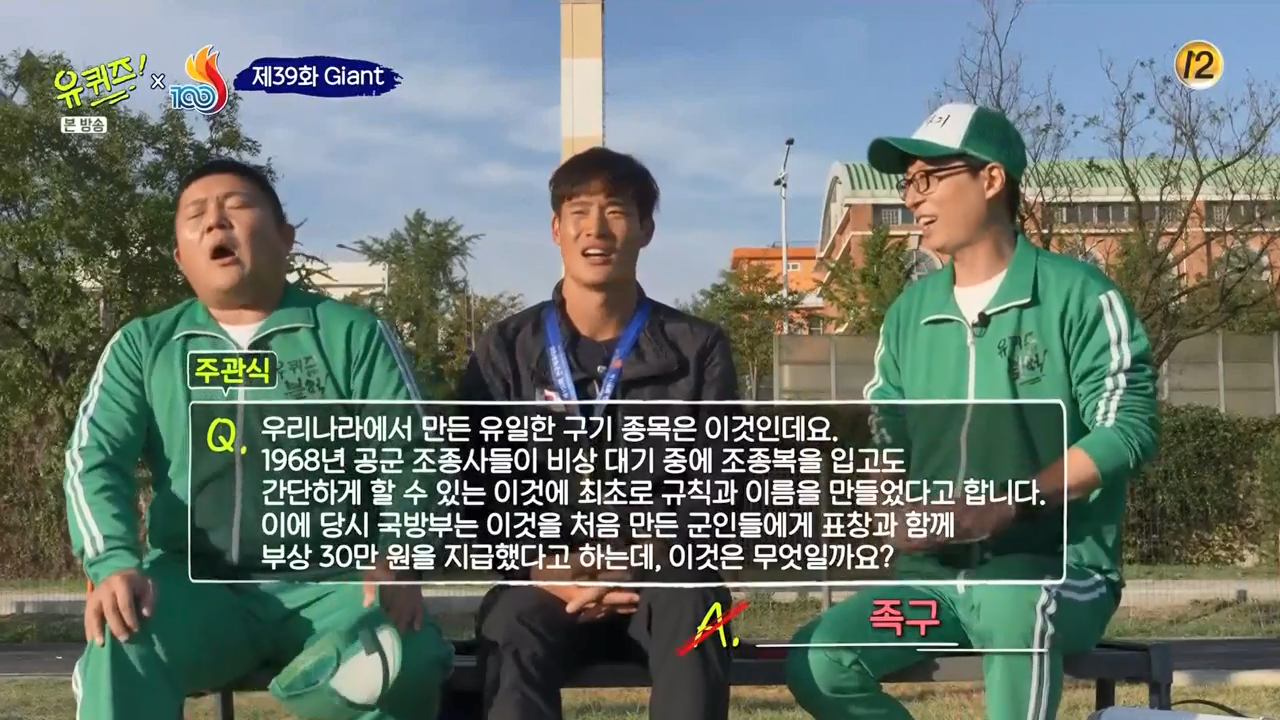 이번 문제는 우리나라에서 만든 유일한 구기 종목을 맞추는 문제였습니다. 공군 조종사들이 비상 대기 중에 조종복을 입고 간단하게 할 수 있는 이것은 족구였습니다. 사실 저도 군대에서 축구만큼 족구를 많이 해서 족구라고 생각했었는데, 긴장했기에 생각을 못하셨던 거 같습니다. 지금까지 모든 선수들이 문제를 못 맞혀서 아쉽네요ㅜ.ㅜ