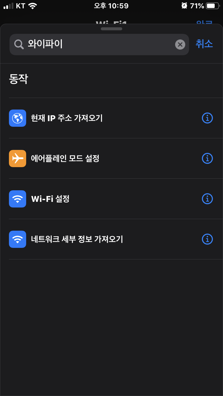 그래서 설정까지 들어가서 완전히 끄고 그랬는데, 저는 요즘 단축어를 사용해서 와이파이를 손쉽게 끄게 됩니다. (와이파이 키는 건 버튼 하나로 원래 가능했기에)